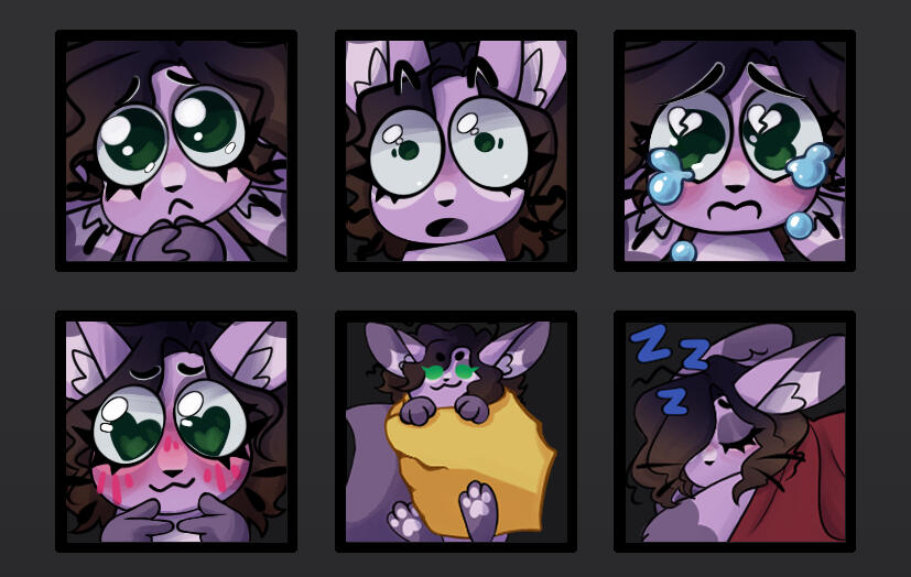 Exaggerated, chibi-style emotes with minimal shading. These work great on Discord and streaming platforms that support them, like Twitch and Picarto.
